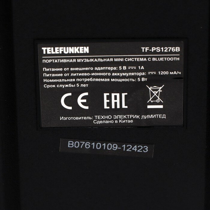 Купить Портативная караоке система Telefunken TF-PS1276B, 35 Вт, FM, AUX, USB, BT, 1200 мАч, чёрная
