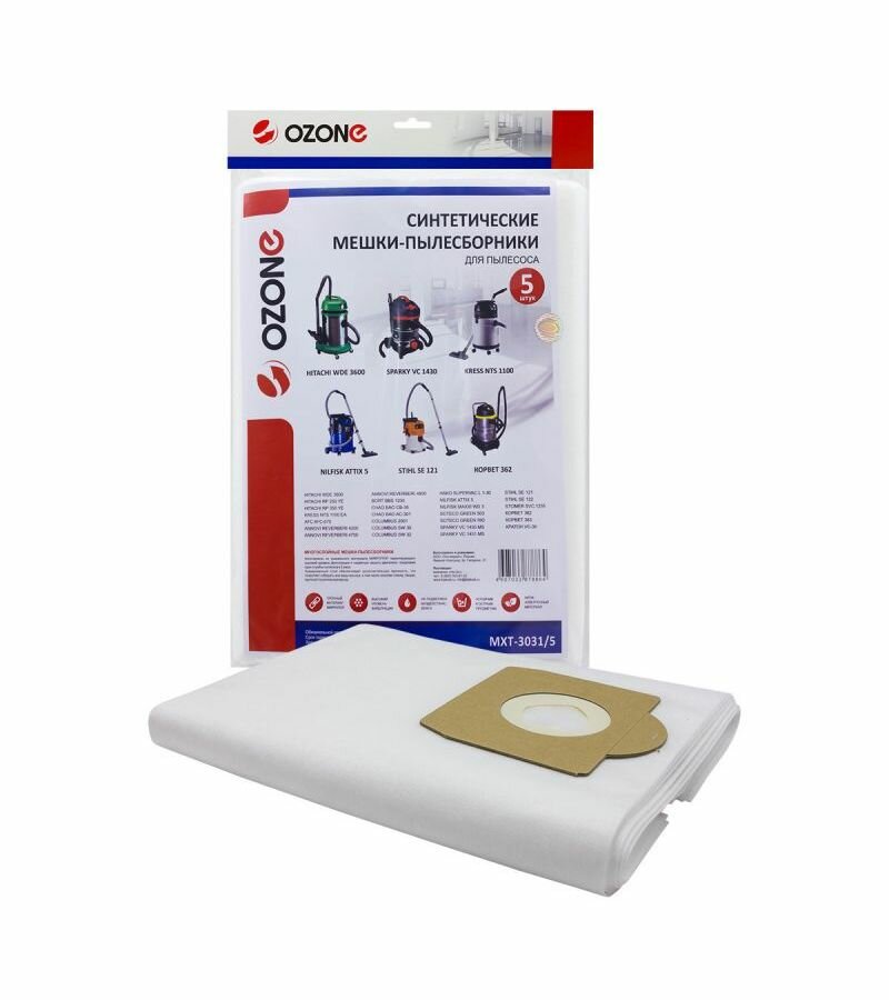 Синтетические мешки-пылесборники Ozone MXT-3031/5 для пылесоса HITACHI WDE 3600, KRESS NTS 1100 EA и других, 5 шт