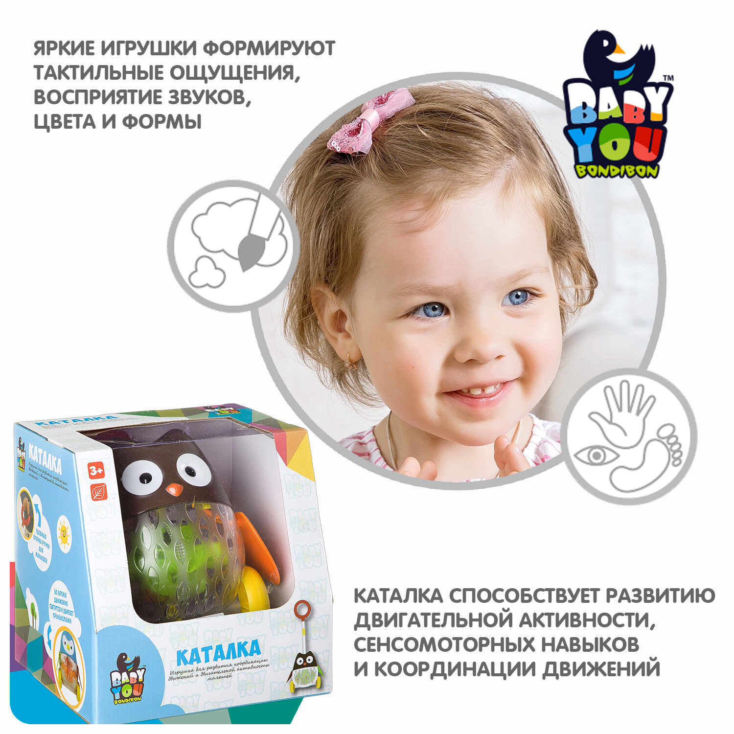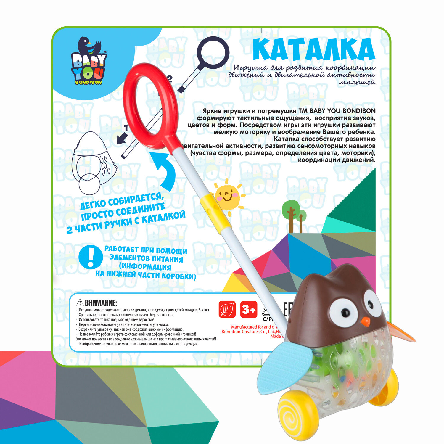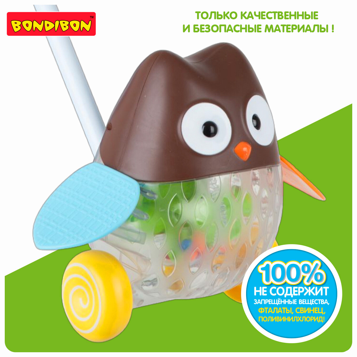 Игр.пласт.свет, каталка с ручкой сова, Bondibon, BOX, 21х18х21 см.