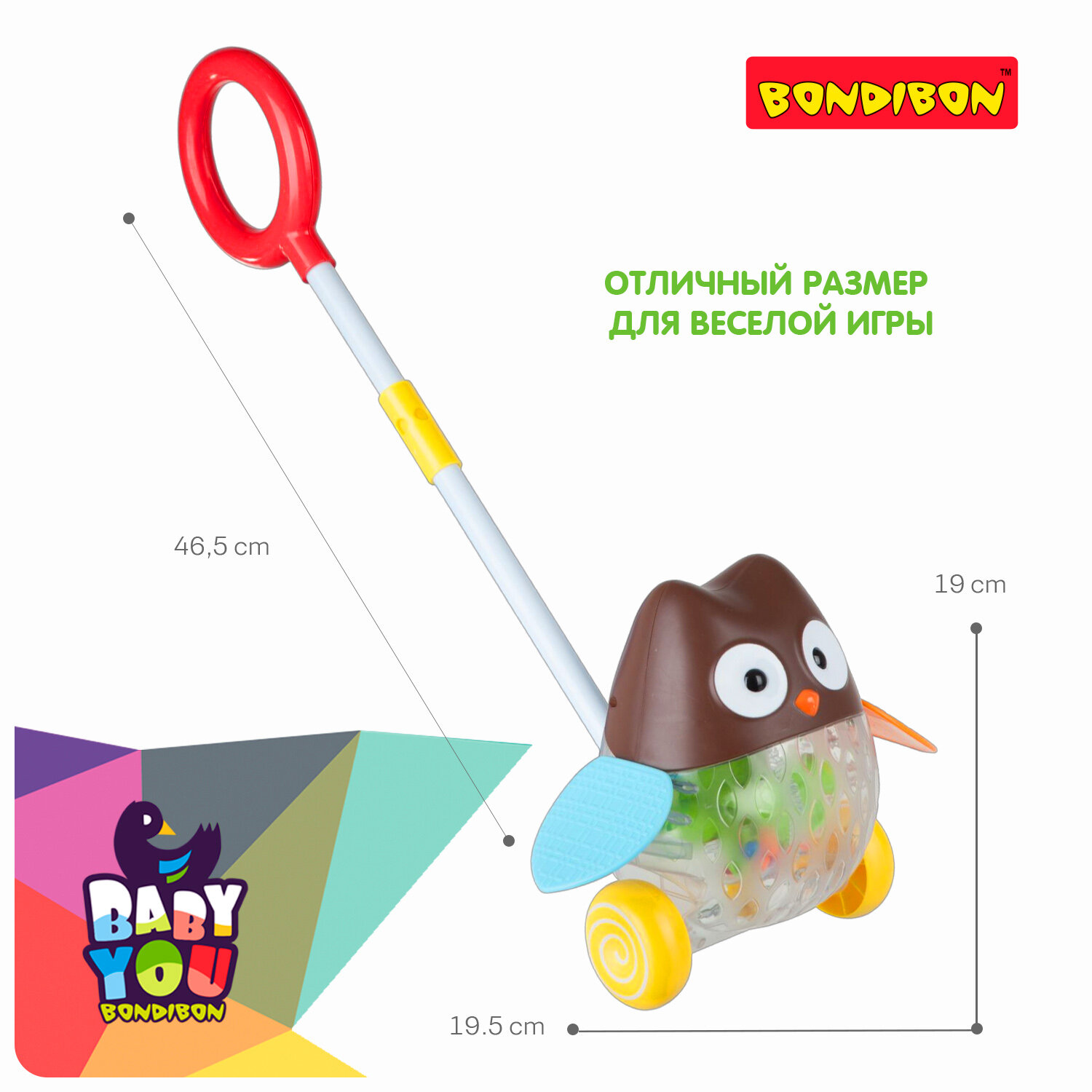 Игрушка-каталка Bondibon Сова, с ручкой, ВВ2381, 21 х 18 х 21 см