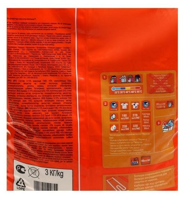Сохраняет цвет, не вызывает аллергии (но не факт, я не аллергик) На упаковке есть вся необходимая информация для потребителя. Хорошо отстирывает пятна, справляется с разными видами загрязнения. |