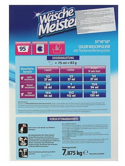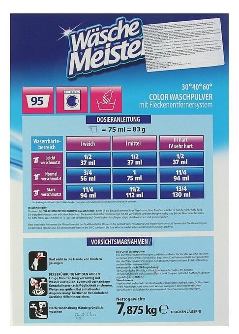 Wasche Meister Waschpulver Color Стиральный порошок для цветных тканей 7,875 кг на 95 стирок