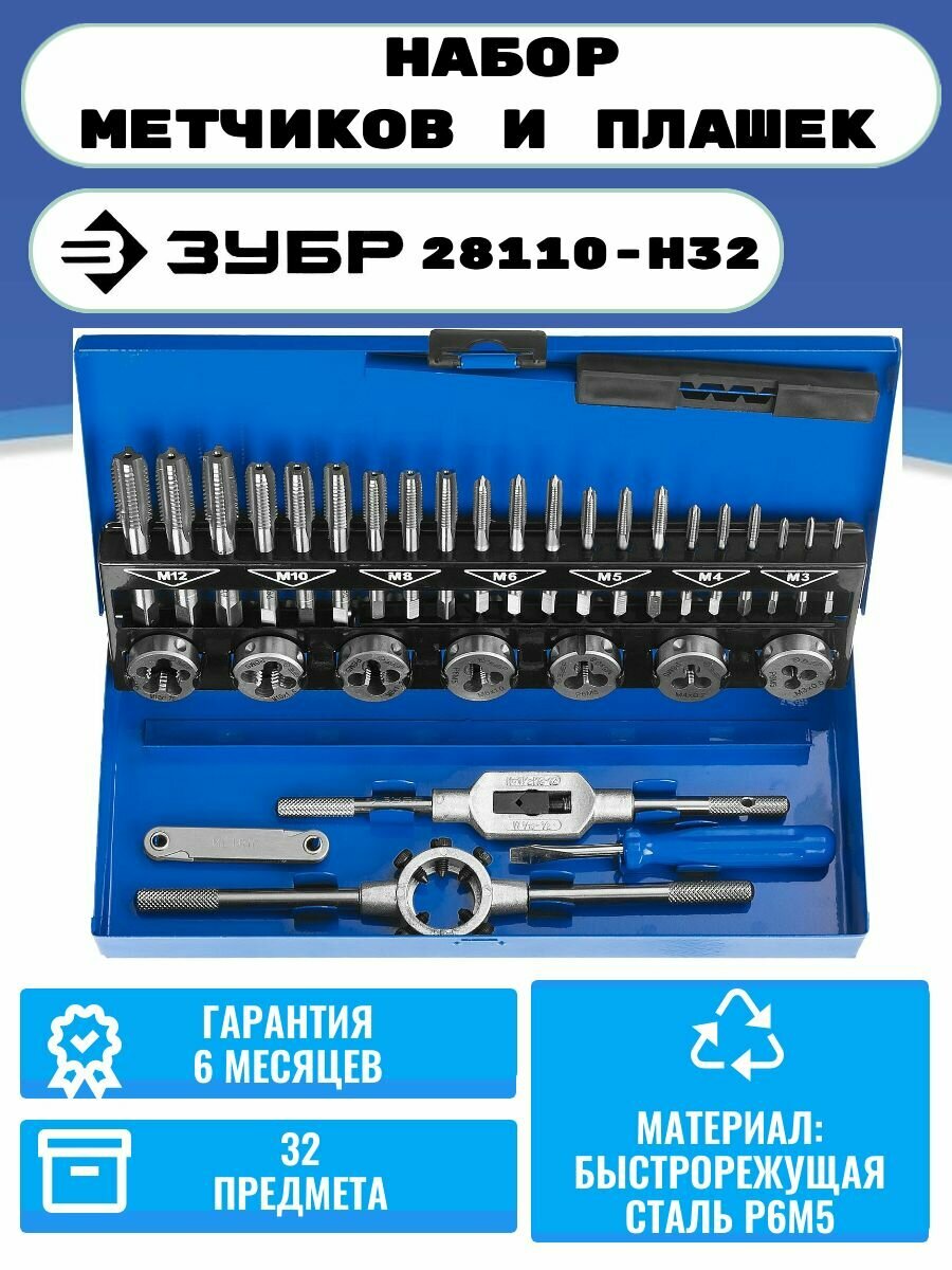 ЗУБР 32 предмета, сталь Р6М5, набор метчиков и плашек, Профессионал (28110-H32)