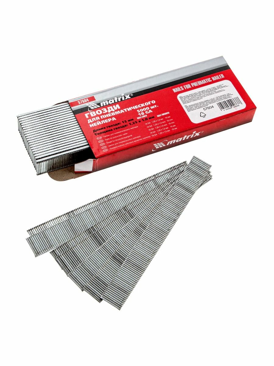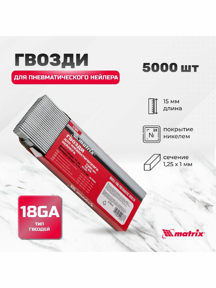 Гвозди 18GA для пневматического нейлера, длина 15 мм, ширина 1.25 мм, толщина 1 мм, 5000 шт Matrix