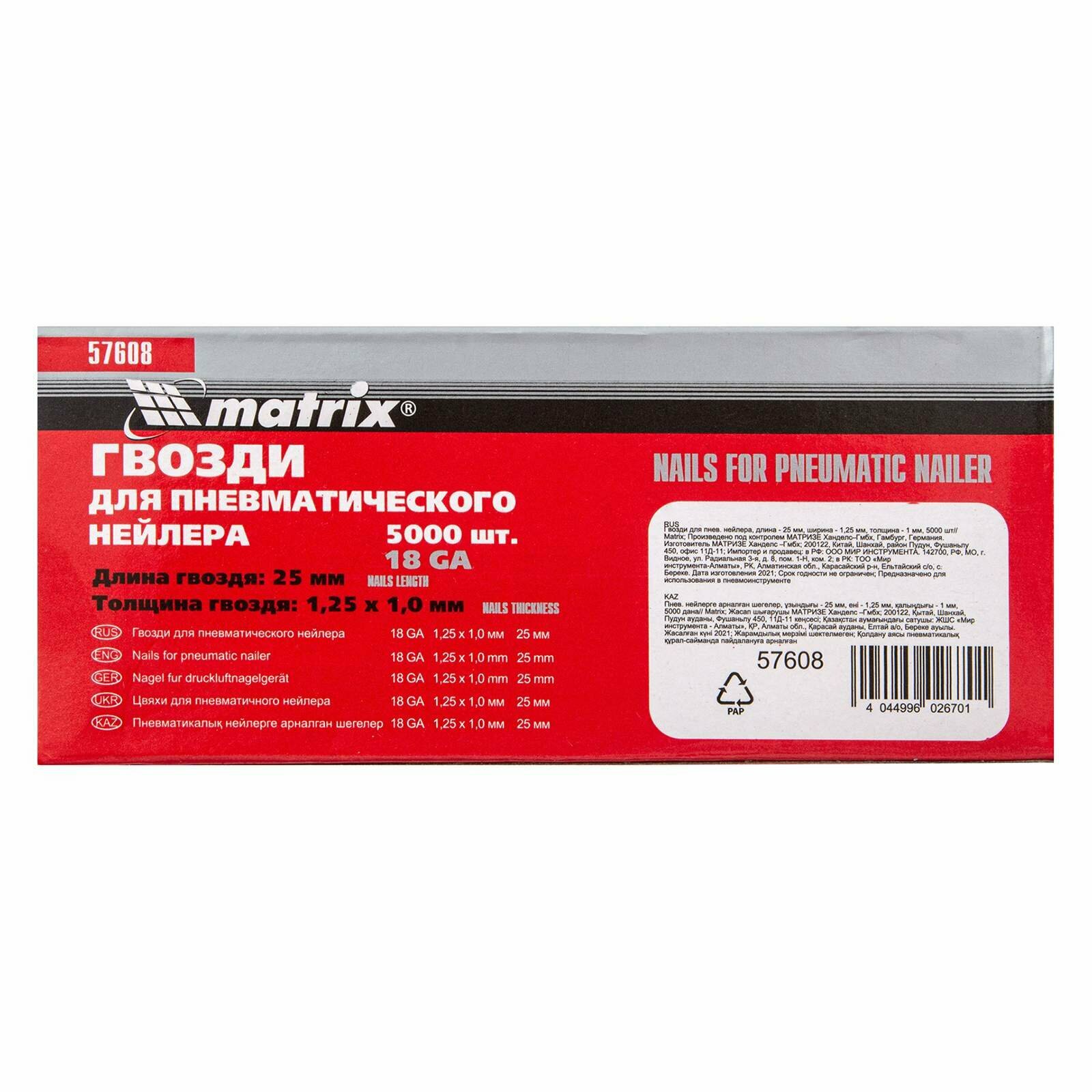 Гвозди для пневматического нейлера, длина 25 мм, ширина 1,25 мм, толщина 1 мм, 5000 шт Matrix