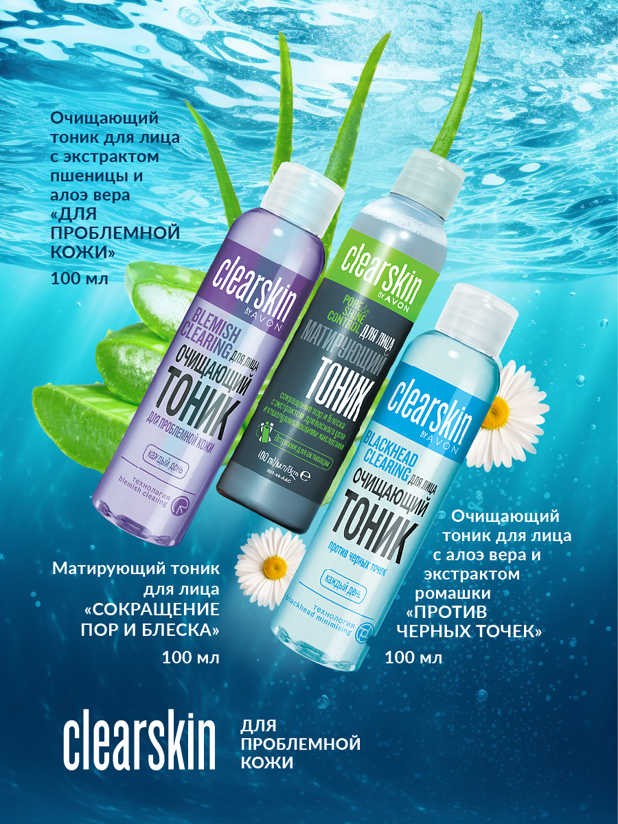 AVON Clearskin Тоник очищающий с алоэ вера и экстрактом ромашки Против черных точек, 100 мл