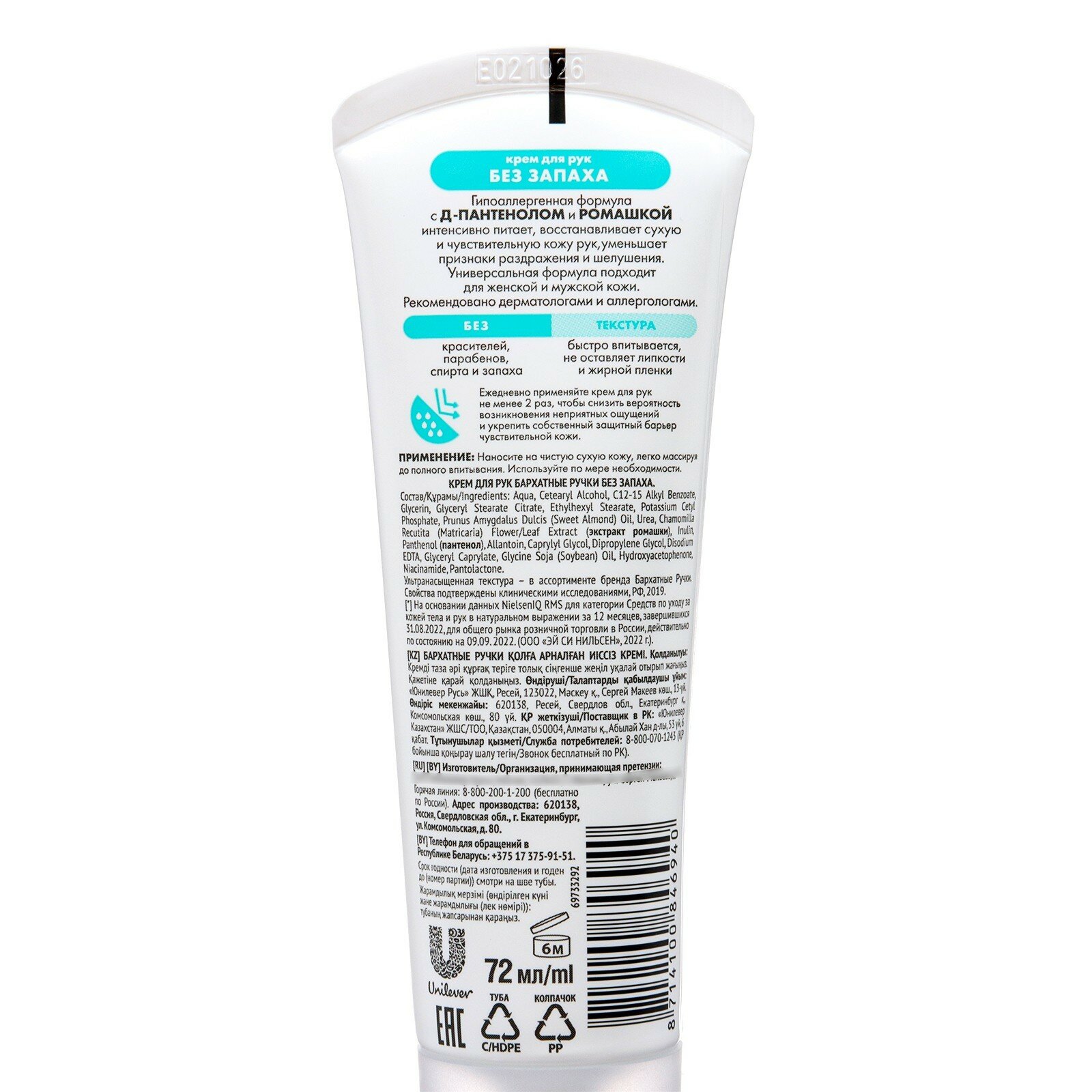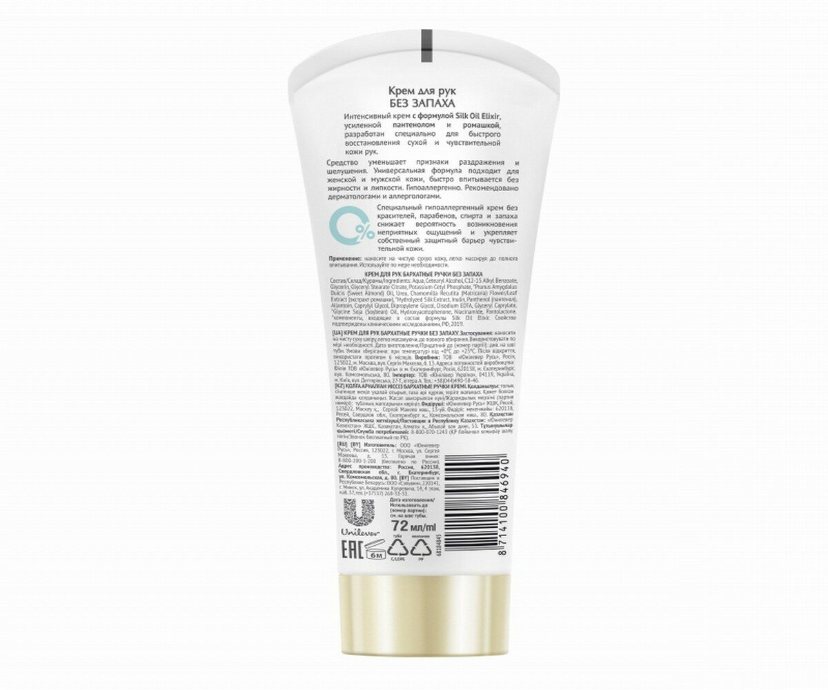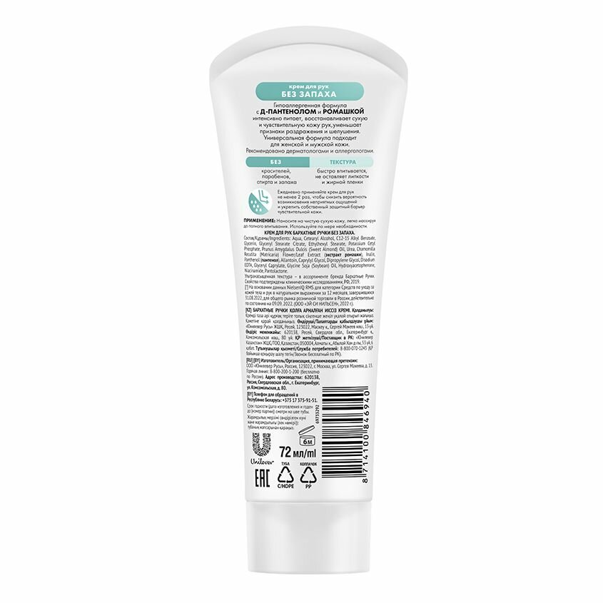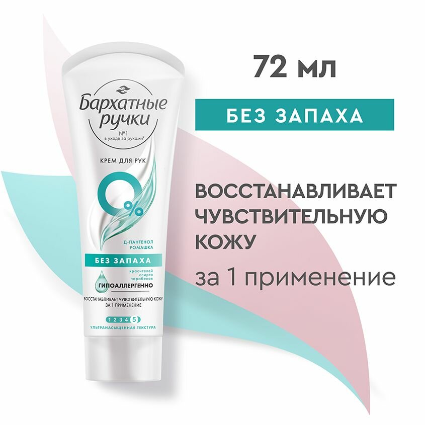 Крем для рук Бархатные ручки Без запаха, для сверхчувствительной кожи, 72 мл Бархатные ручки 50598 .