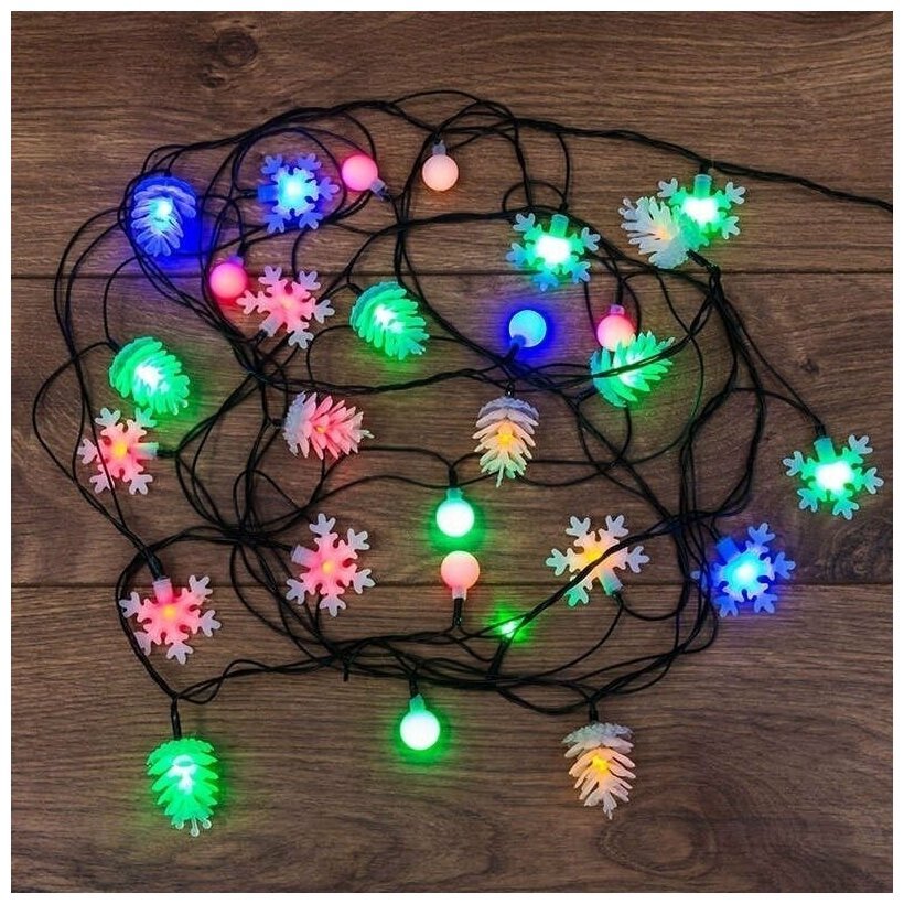 Светодиодная гирлянда NEON-NIGHT "Шарики-Снежинки-Елочки" 4.4 м, 8 режимов, 30 разноцветных светодиодов, тёмно-зелёный провод