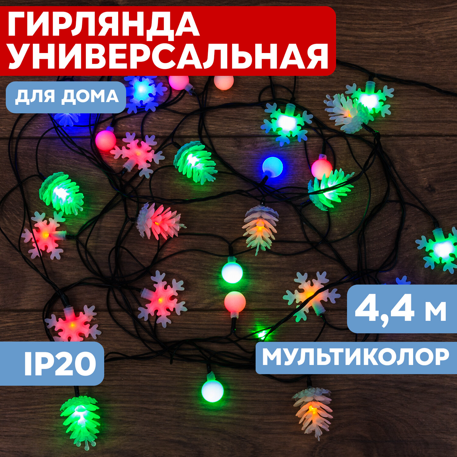 NEON-NIGHT Гирлянда светодиодная универсальная с насадками (шарики, снежинки, елочки) 30 LED мультиколор, 4,4 метра с контроллером
