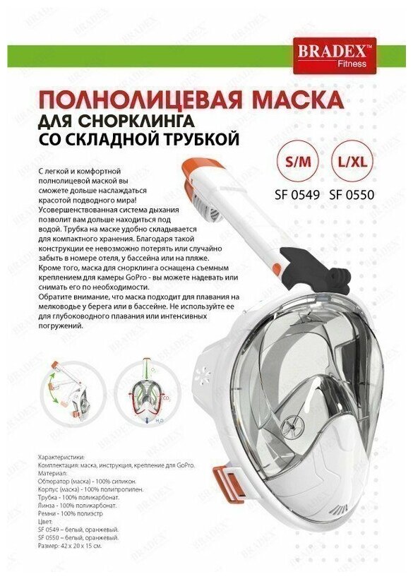 Маска Bradex полнолицевая для снорклинга со складной трубкой, S