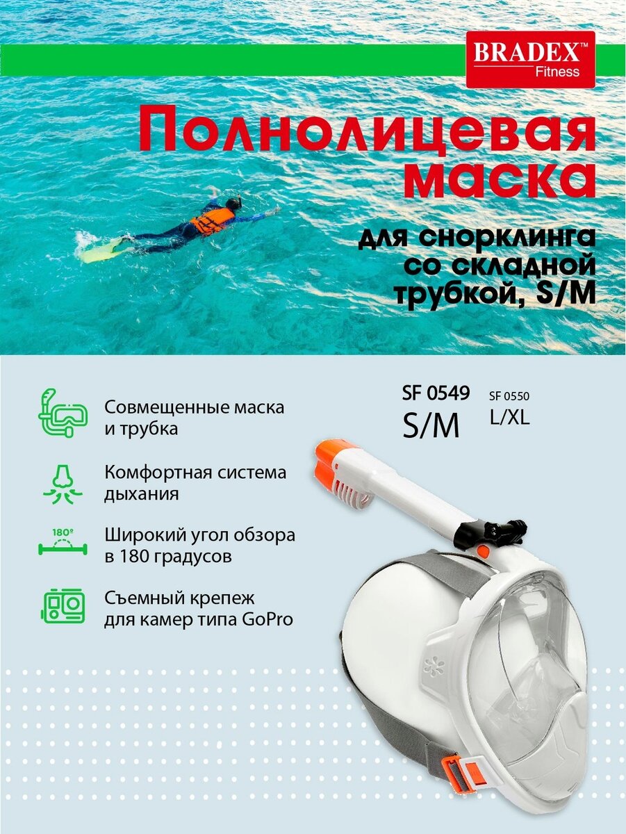 СохранитьBRADEX Полнолицевая маска для снорклинга со складной трубкой, S,M, BRADEX интересное: