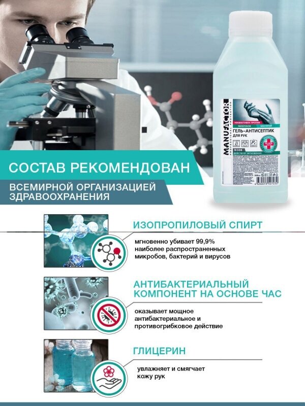 Антисептик-гель для рук спиртосодержащий (спирт 66%-70%) с дозатором 1л MANUFACTOR, дезинфицирующий, N30830