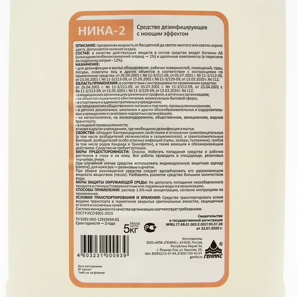 Средство дезинфицирующее 5 кг, НИКА-2, с моющим эффектом, концентрат