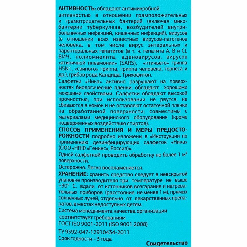 Дезинфицирующие салфетки Ника, 60 шт. Геникс