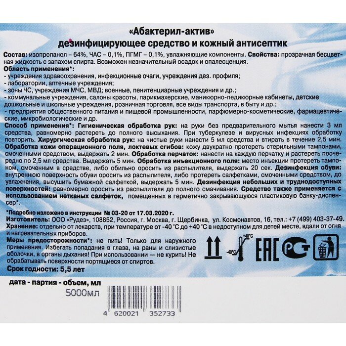 Антисептик "Абактерил-Актив", кожный, дезинфекция поверхностей, лосьон, 5 л интересное: