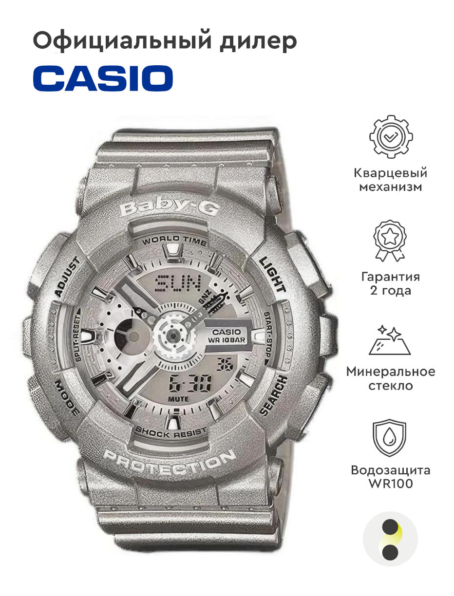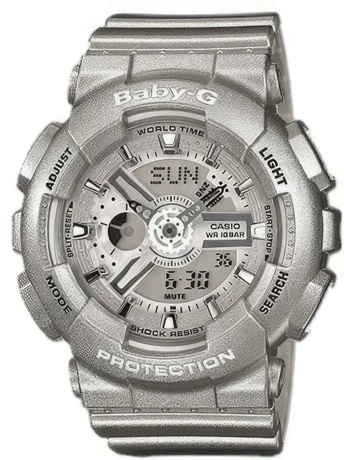 Наручные часы CASIO Baby-G BA-110-8A кварцевые, будильник, секундомер, таймер обратного отсчета, водонепроницаемые, противоударные, подсветка стрелок, подсветка дисплея, серый, серебристый