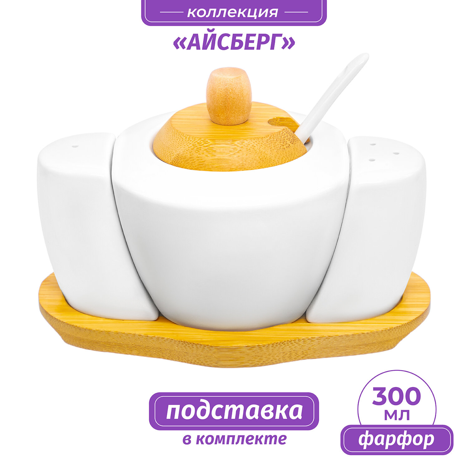 Купить Набор - сахарница 300 мл 16*10*11 см "Айсберг" с ложкой + солонка + перечница на дер. подст.
