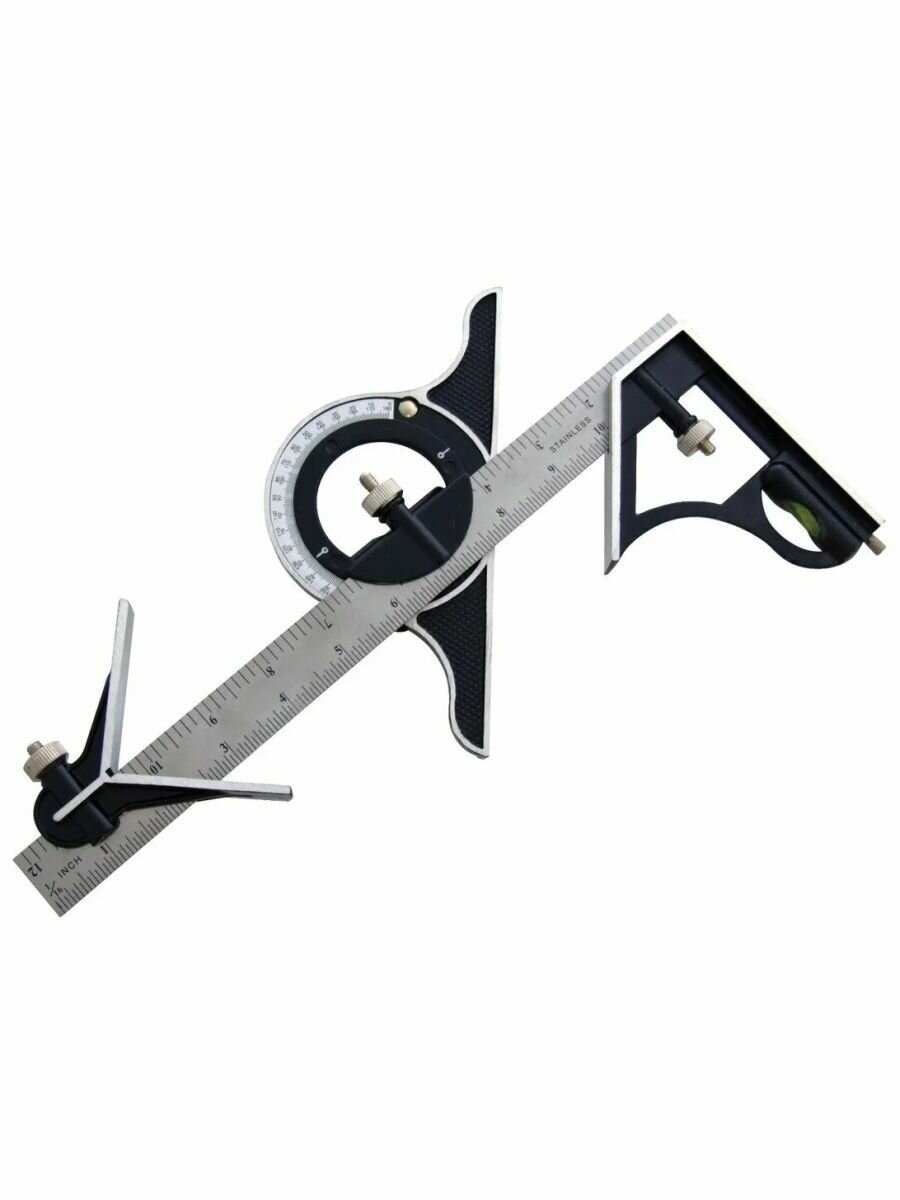 | Плюсы: | Инструмент довольно универсальный, можно использовать и в качестве угольника (дополнительным углом 45 градусов), и угломера, и центроискателя для небольших заготовок. Все компоненты съёмные с фиксацией винтами. На угольнике и транспортире есть пузырьковые уровни. |