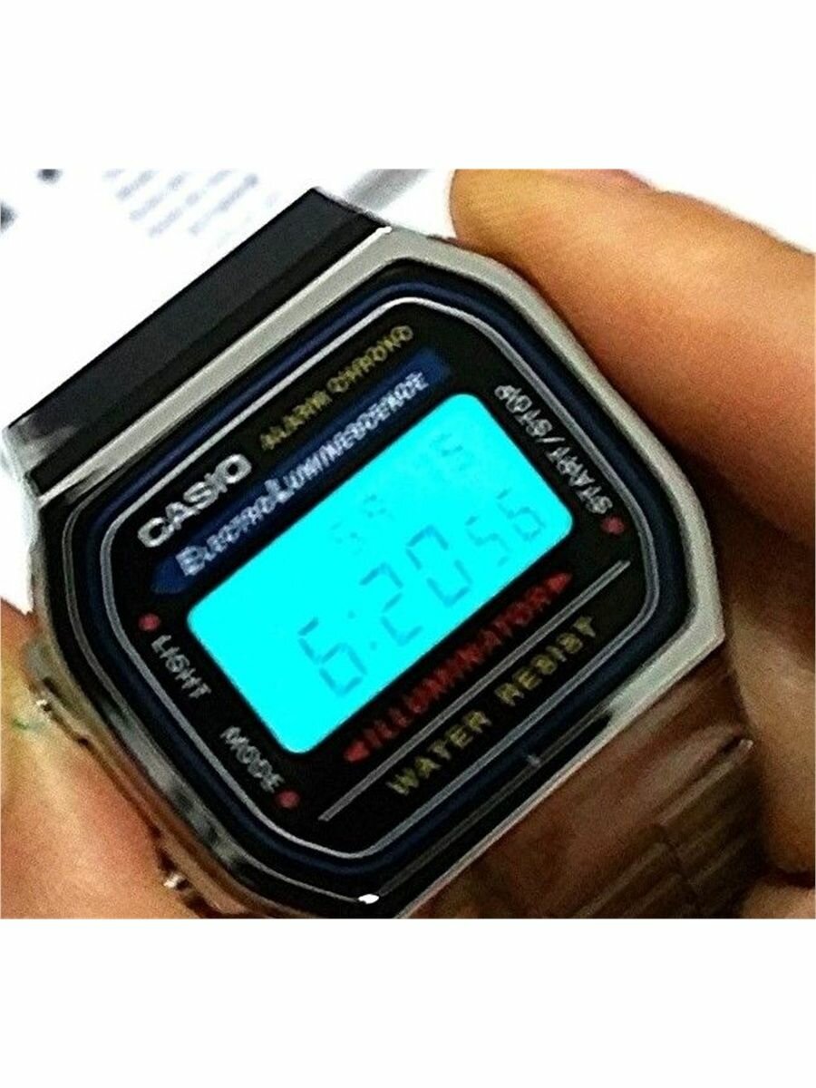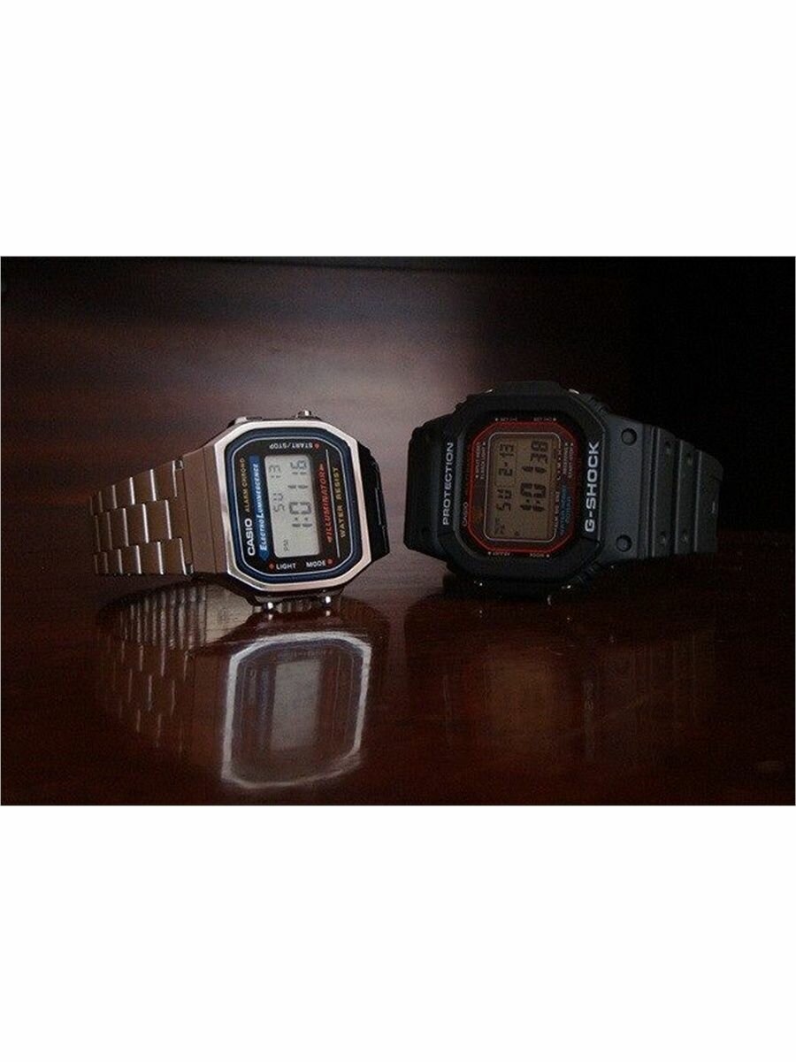 Легкие, удобные на руке. "Модные", в хорошем смысле. Информативные (с моим зрением это важно). Отбивают часы -- удобно. Будильник, конечно, никого разбудить не может)), ставлю его на время, когда уже точно-точно надо выходить на работу. Равномерная красивая подсветка. В "Электронике", да и в старых Casio, была лампочка слева, насколько я помню. Периодически задеваю ими о дверные косяки, но повреждения (они на гранях корпуса, а не на стекле) в глаза не бросаются. Проходят тест Casio на подлинность -- долгое нажатие правой кнопки. |