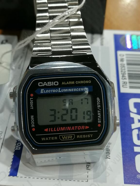 Легкие, удобные на руке. "Модные", в хорошем смысле. Информативные (с моим зрением это важно). Отбивают часы -- удобно. Будильник, конечно, никого разбудить не может)), ставлю его на время, когда уже точно-точно надо выходить на работу. Равномерная красивая подсветка. В "Электронике", да и в старых Casio, была лампочка слева, насколько я помню. Периодически задеваю ими о дверные косяки, но повреждения (они на гранях корпуса, а не на стекле) в глаза не бросаются. Проходят тест Casio на подлинность -- долгое нажатие правой кнопки. |