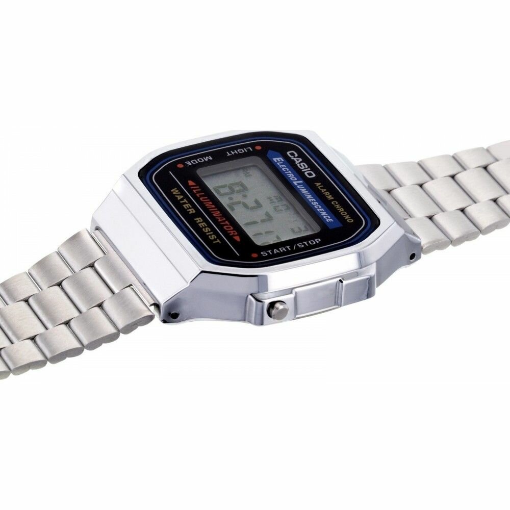 A168WEM-2E Casio наручные часы кварцевые WR30 (3 атм) мужские, женские серебряный, голубой секундомер будильник отображение числа, отображение дня недели, отображение месяца подсветка дисплея акриловое стекло