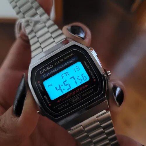 Легкие, удобные на руке. "Модные", в хорошем смысле. Информативные (с моим зрением это важно). Отбивают часы -- удобно. Будильник, конечно, никого разбудить не может)), ставлю его на время, когда уже точно-точно надо выходить на работу. Равномерная красивая подсветка. В "Электронике", да и в старых Casio, была лампочка слева, насколько я помню. Периодически задеваю ими о дверные косяки, но повреждения (они на гранях корпуса, а не на стекле) в глаза не бросаются. Проходят тест Casio на подлинность -- долгое нажатие правой кнопки. |