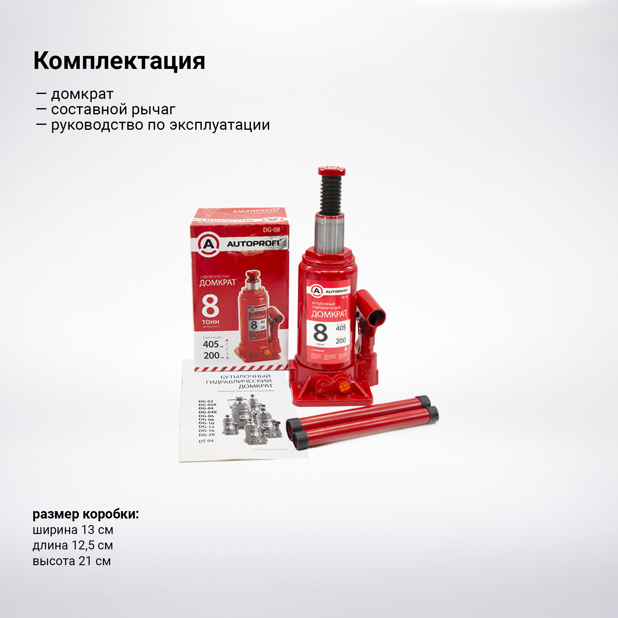 DG-08_домкрат! бутылочный гидравлический, 8 тонн, защита от перегруза, высота подъёма 200-405мм\ AUTOPROFI DG08 | цена за 1 шт