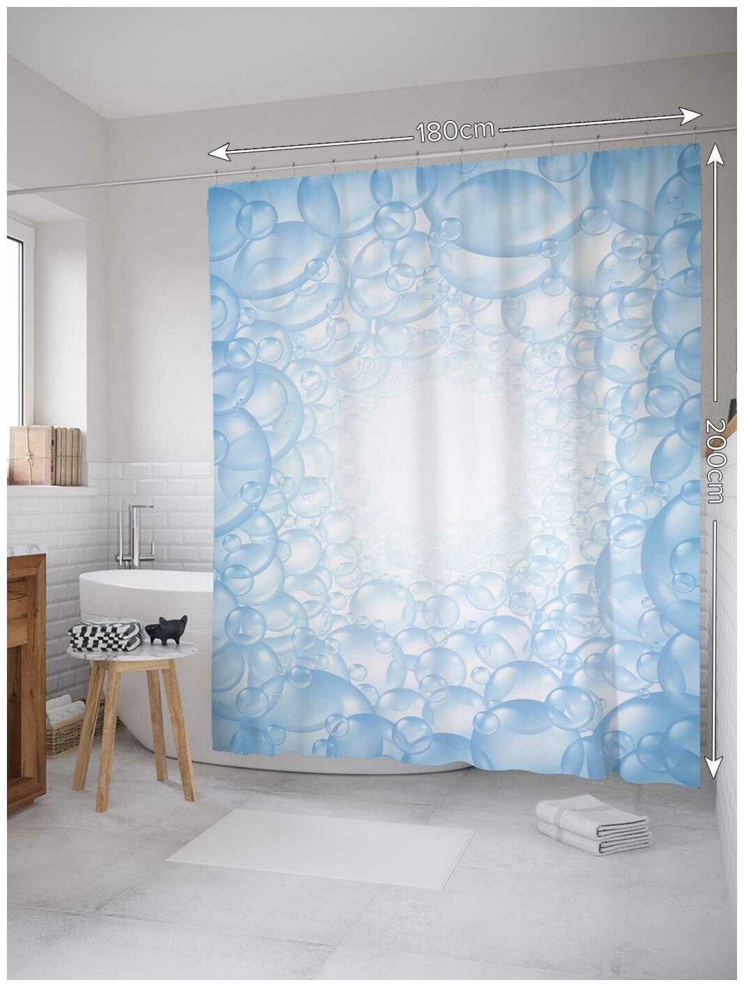 Купить Штора (занавеска) для ванной JoyArty "Синий пузырчатый тоннель" из сатена, 180х200 см с крючками