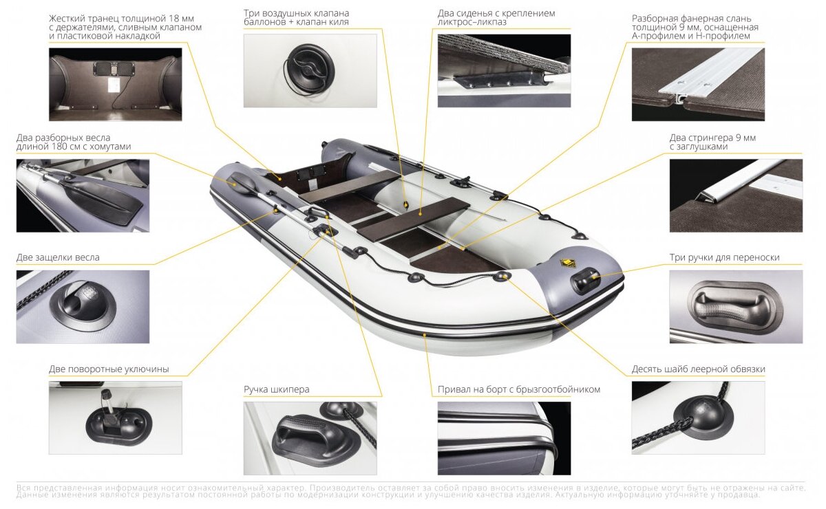 Слабая ПВХ ткань, как показали испытания. Нет усиления ткани под стрингерами Место крепления лодочного мотора - только фанера, нет намека ни на какие пластиковые накладки. Крышка клапана переднего баллона потерялась во второй же выезд на реку. |