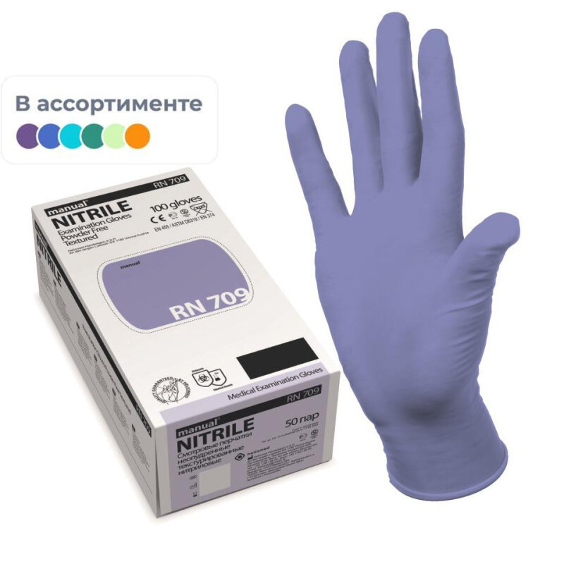 Перчатки медицинские смотровые Manual RN 707 нитриловые неопудренные в ассортименте (размер L, 100 штук/50 пар в упаковке)
