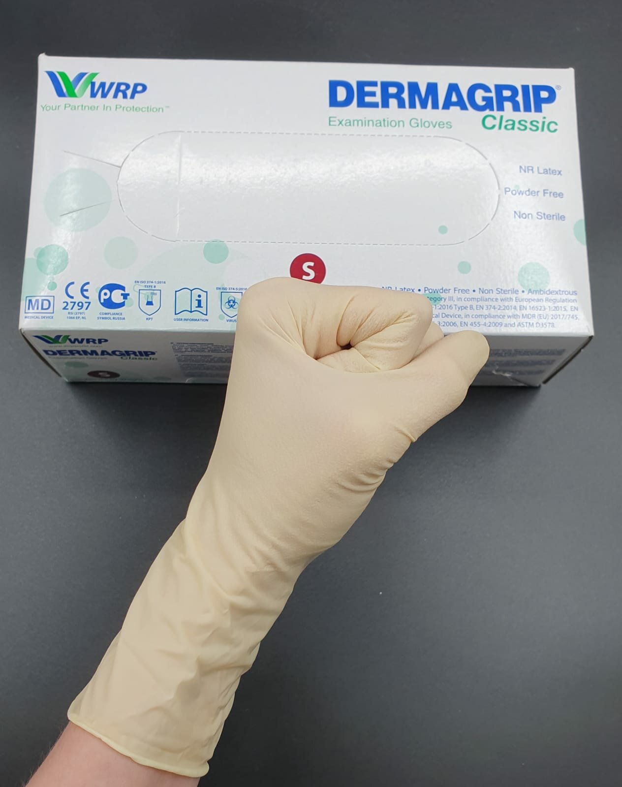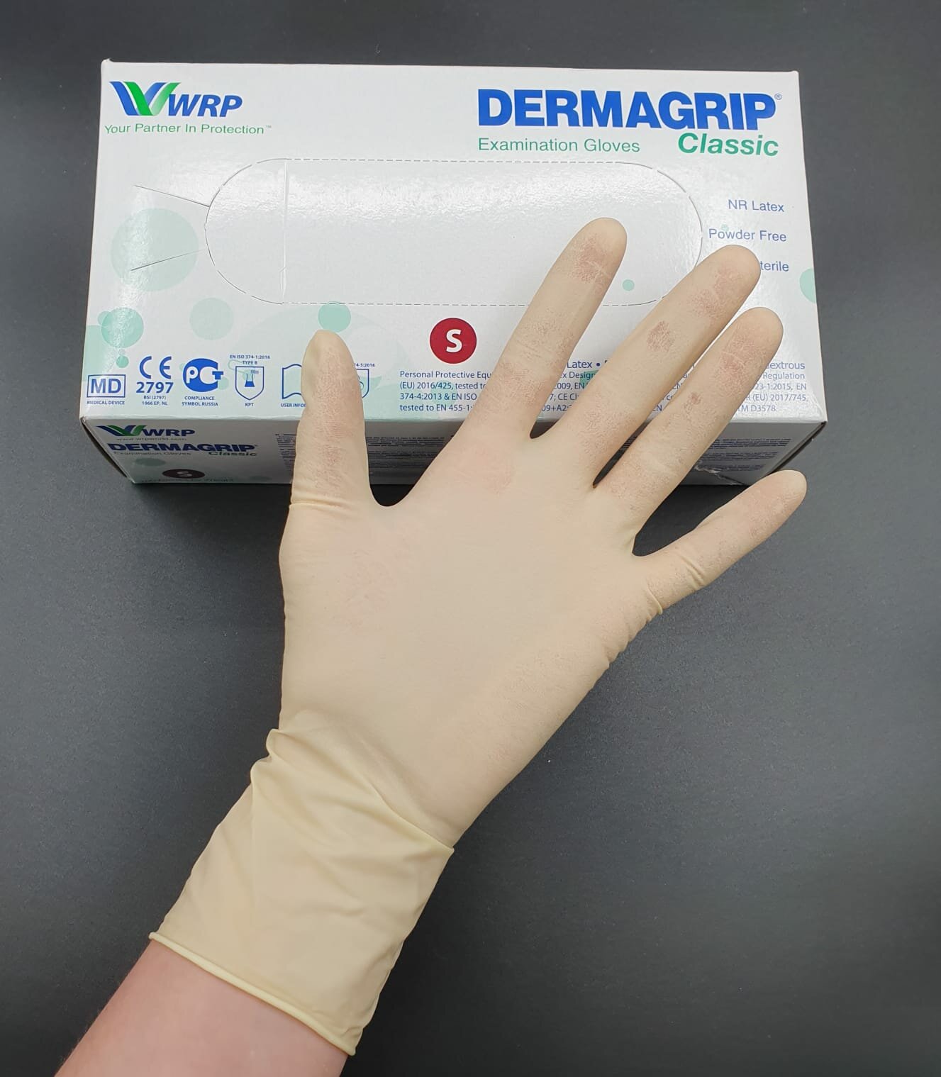 Перчатки латексные смотровые WRP Dermagrip Classic, 50 пар/100 штук, размер: S, цвет: светло-желтый