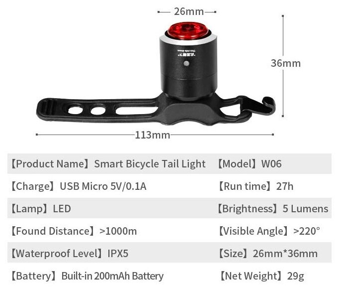 Обладает встроенным датчиком освещенности, включается автоматически с наступлением сумерек. Выключается также автоматически, через две минуты после остановки, или нахождения в состоянии покоя. Заряжается через порт USB. Качественный алюминиевый корпус, удобное универсальное крепление. |
