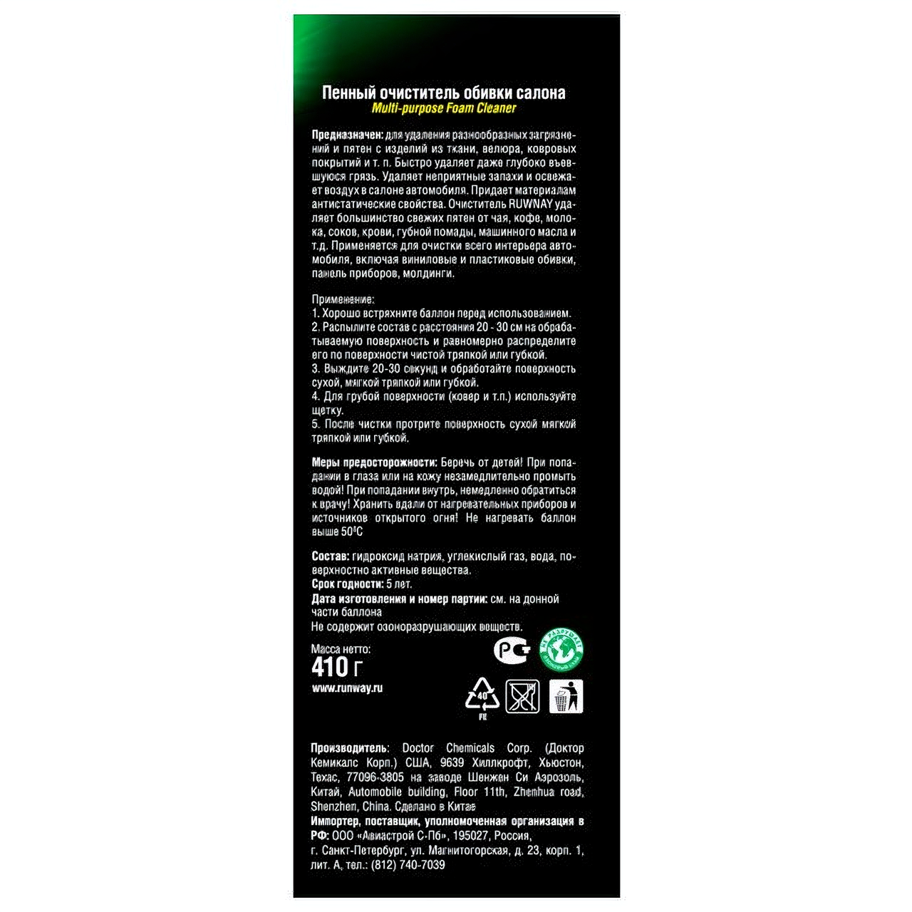 RUNWAY Пенный очиститель обивки салона автомобиля RW6083, 0.65 л интересное: