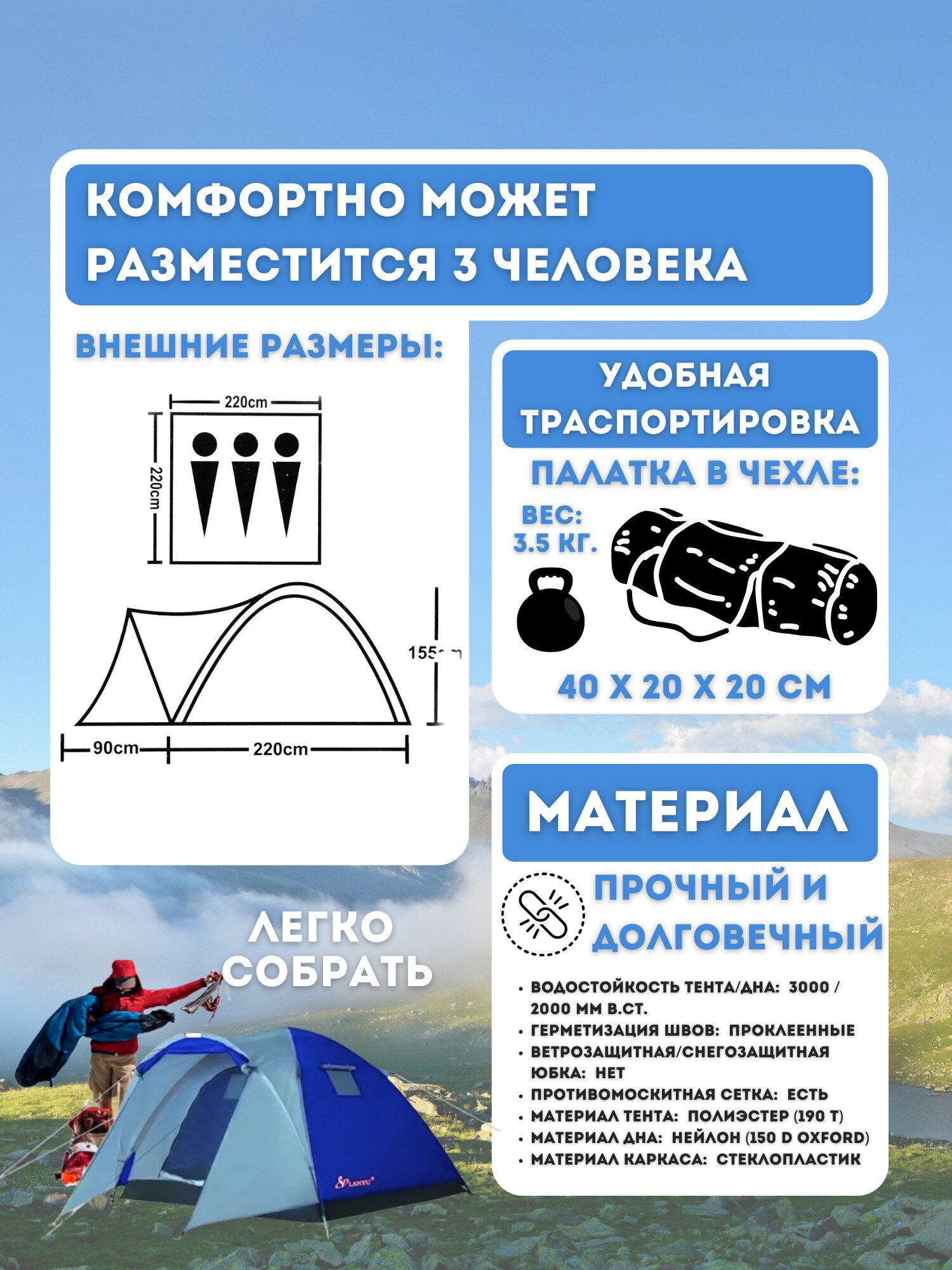 | Водостойкость тента | 3000 мм в.ст. |