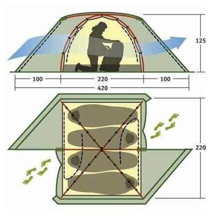 | Плюсы: | большая палатка (мы спали в ней втроем спокойно); не протекает (два дня шел сильный дождь, ничего не промокло) – швы отличные + есть юбка по периметру; при этом в палатке не душно, вентиляция хорошая; внутри много полочек, карманов и т.д. |