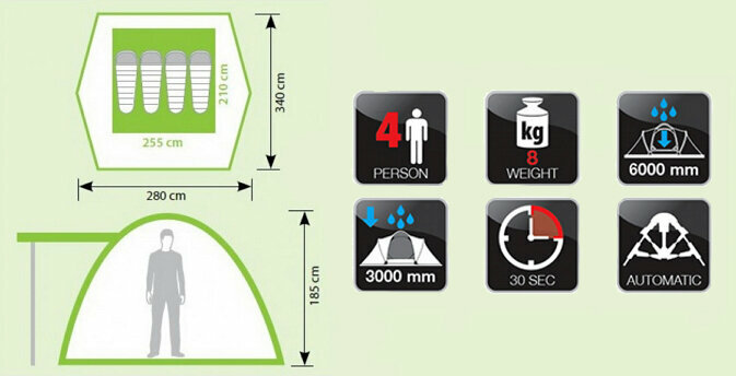 | Габариты внешней палатки(ДxШxВ) | 340x280x185 cм |
