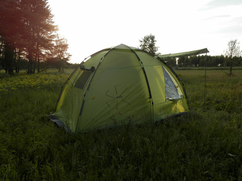| Минусы: | 1.С внутренней стороны внешней палатки,скапливается конденсат. 2.Ткань(возможно пока она новая) не только не пропускает влагу,но и не даёт скатываться каплям дождя,т.е. стоит палатка после дождя очень красивая,как лист в утренней росе и эта роса не стекает и не сохнет почти целый день)) Досушивали палатку дома(( |