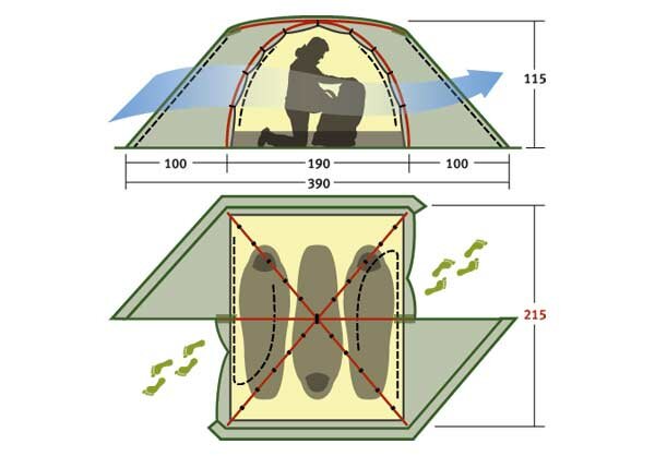 | Плюсы: | Двухслойная, можно ставить отдельно только внутренний тент в очень жаркую погоду. При установке внешнего тента надежно защищает от дождя. |