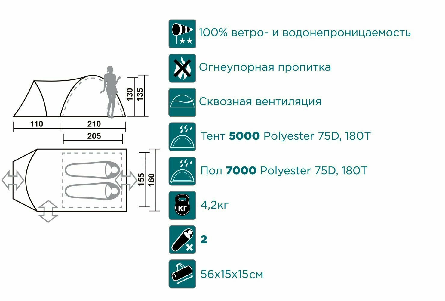 | Водостойкость тента | 4000 мм в.ст. |
