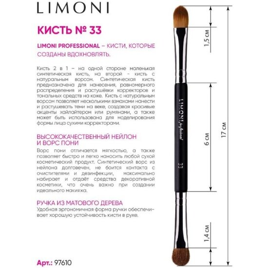 LIMONI №36 Кисть двусторонняя для бровей и ресниц (нейлон/синтетика), Limoni