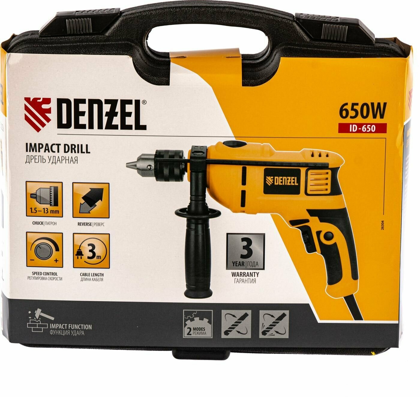 26304_Дрель! Ударная Id-650 650Вт, 0-3000 Об/М, 48000 Уд/М, Патрон Ключевой (Кейс) Denzel арт. 26304