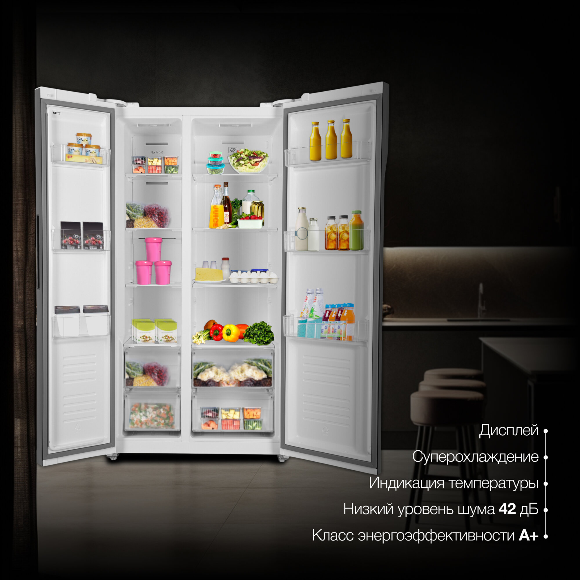 | Плюсы: | Здоровенный объем 537 литров. Красивый внешний вид. Куча разных полок внутри. Мощно морозит и охлаждает. |