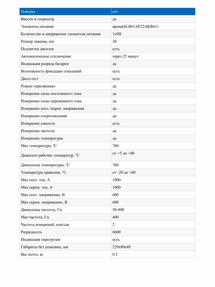 | Измерение сопротивления | есть |