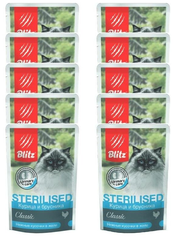 Купить Влажный корм для стерилизованных кошек Blitz Classic с курицей, с брусникой 10 шт. х 85 г (кусочки в желе)