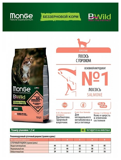 Сухой корм для кошек Monge BWILD Feed the Instinct, беззерновой, с лососем, с горошком 1.5 кг.