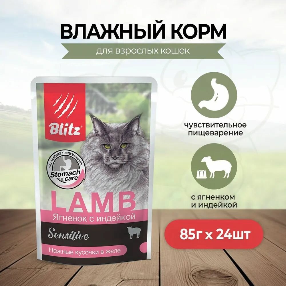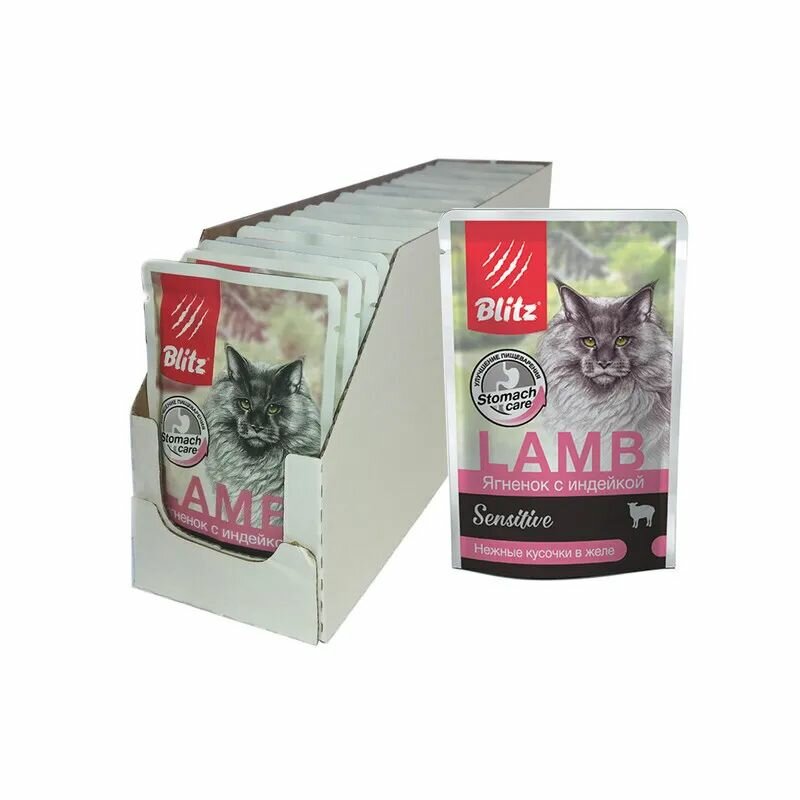 Купить BLITZ SENSITIVE для взрослых кошек с чувствительным пищеварением с ягненком и индейкой в желе (85 гр х 24 шт)
