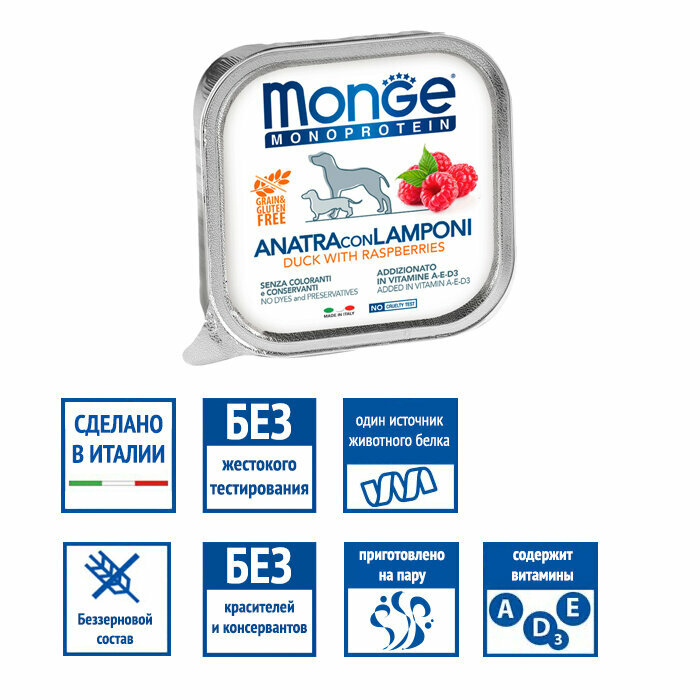 Влажный корм для собак Monge Dog Monoprotein ANATRA con LAMPONI, беззерновой, утка, с малиной, 150 г