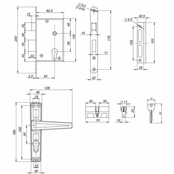 Замок врезной Зенит цилиндровый с защёлкой в комплекте с ручкой ЗВ4-3.01 (серебро), 4 ключа