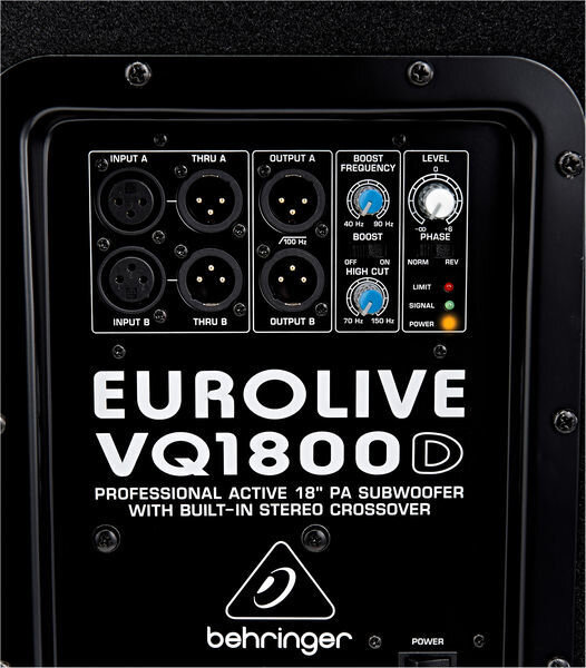 Behringer VQ1800D активный сабвуфер 200/500Вт 18" 40-200Гц 124дБ, стерео-кроссовер ФВЧ 100Гц, ФНЧ 70-150Гц моно,BOOST 40-90Гц, сткан на35мм