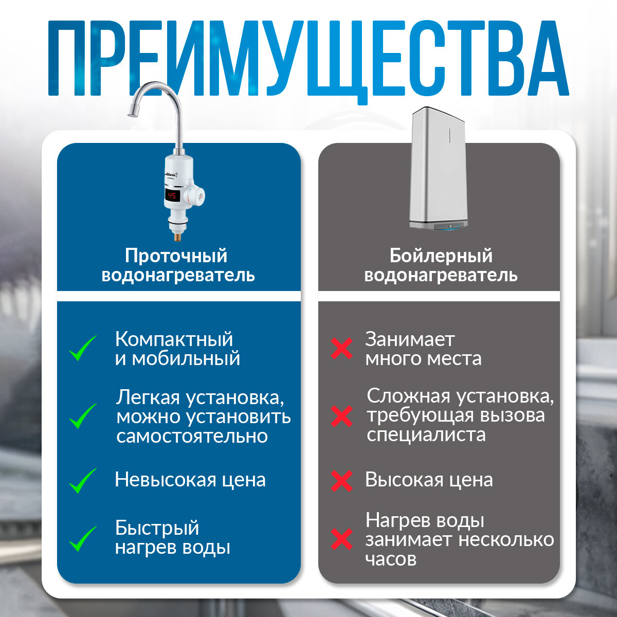 | Плюсы: | Задумка хорошая, вода срузу горячая течет |